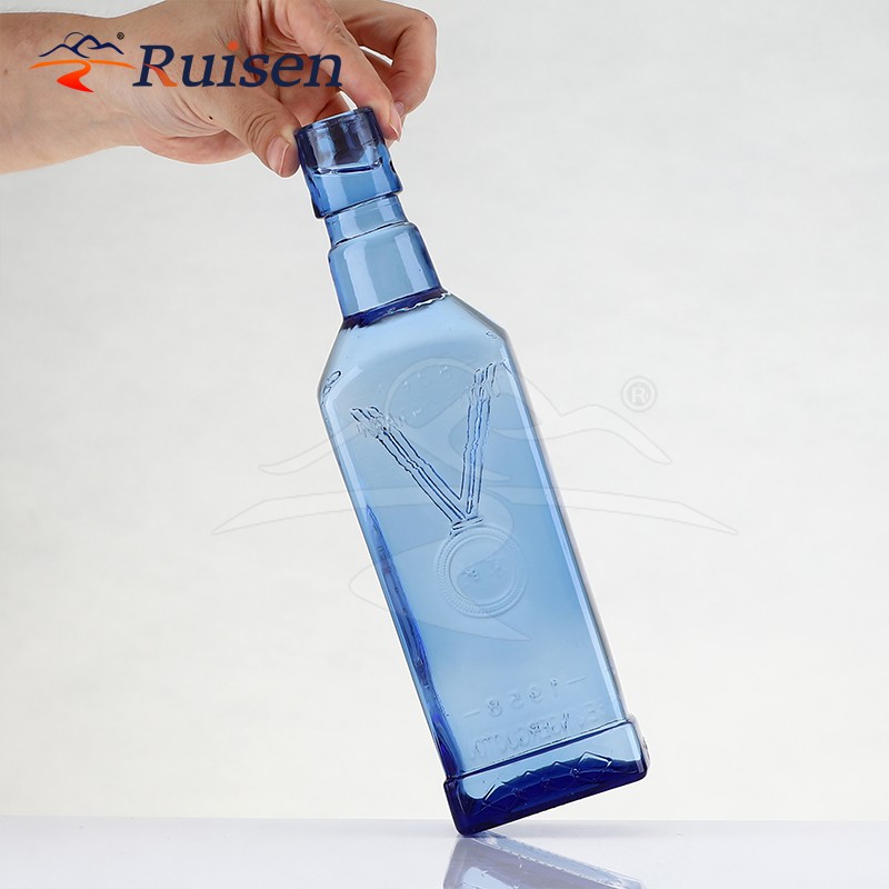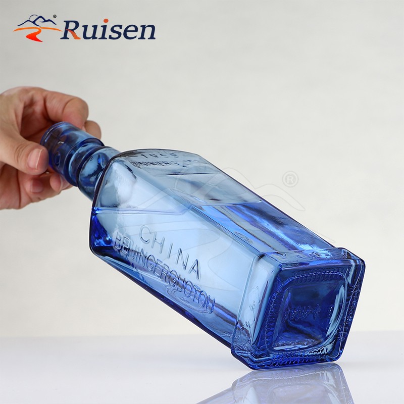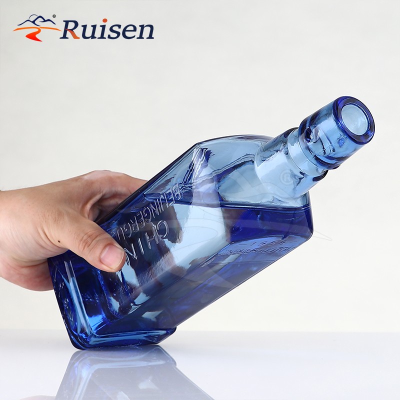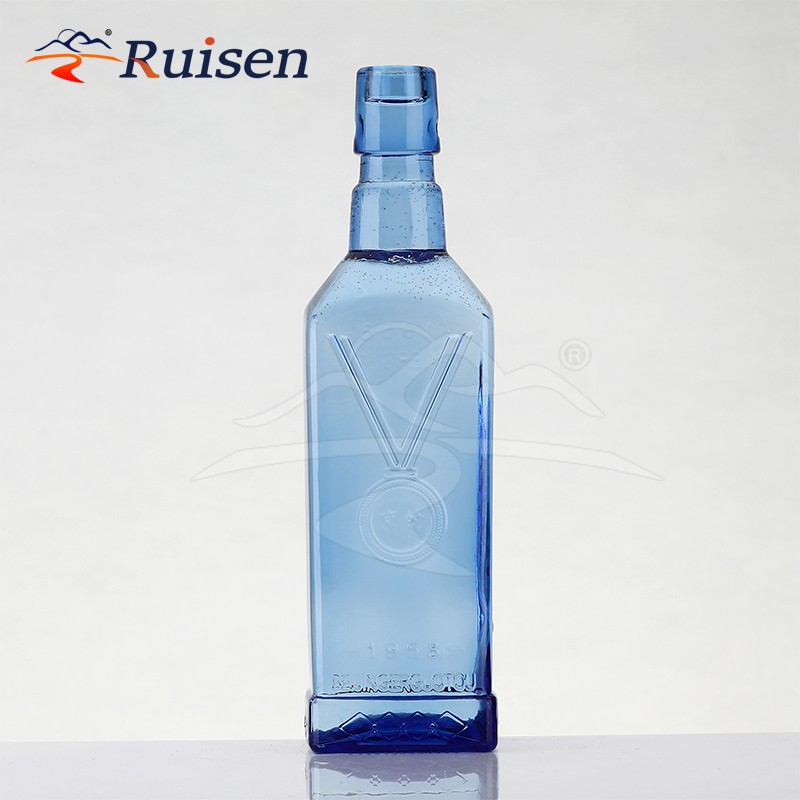 500ml Custom Design Embossed Logo Square Blue Glass Empty Bottle for Beverage Liquor Alcohol